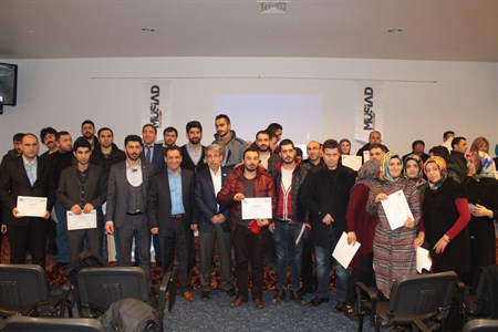 Erzurum'da MÜSIAD Erzurum Sube Baskanligi ve KOSGEB Il Müdürlügü'nün genç girisimcilere yönelik düzenlendigi “Uygulamali Girisimcilik” egitimi kapsaminda sertifika töreni düzenlendi.Necip Fazil Kisakürek Kültür Merkezi Salonu’ndan düzenlenen sertifika töreninde 120 genç girisimciye sertifikalari verildi. Dört grup halinde 10 gün süren egitimlerinin tamamlayan genç girisimciler, hazirlayacaklari genis proje kapsaminda 50 bin ve 100 bin TL arasinda faizsiz kredi almaya hak kazanacaklar. Sertifika törenine MÜSIAD Sube Baskani Taner Bayir, Yönetim Kurulu üyeleri ve KOSGEB yöneticileri katildi.