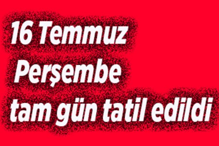 Basbakan Ahmet Davutoglu, 16 Temmuz Persembe günü kamu kurum ve kuruluslarinda çalisanlarin yarim gün izinli sayilmasina iliskin yaziyi imzaladi. Persembe günü kamu kurumlarinda çalisanlar tam gün tatil yapacak.Basbakan Ahmet Davutoglu, 16 Temmuz Persembe günü kamu kurum ve kuruluslarinda çalisanlarin yarim gün izinli sayilmasina iliskin yaziyi imzaladi. Persembe günü kamu kurumlarinda çalisanlar tam gün tatil yapacak.Konuyla ilgili Basbakanlik’tan yapilan açiklama söyle: “Sayin Basbakanimiz Ahmet Davutoglu 16 Temmuz Persembe günü kamu kurum ve kuruluslarinda çalisanlarin yarim gün izinli sayilmasina iliskin yaziyi imzalamistir. Buna göre, gerekli tedbirlerin alinarak hizmetlerin aksatilmamasi, zorunlu hizmetlerin yürütülmesi için asgari seviyede eleman bulundurulmasi kaydiyla, kamu kurum ve kuruluslarindaki tüm çalisanlar, Ramazan Bayrami’nin arifesi 16 Temmuz 2015 Persembe günü idari izinli sayilacaktir. Yazi ilgili kurumlara gönderilmistir.”