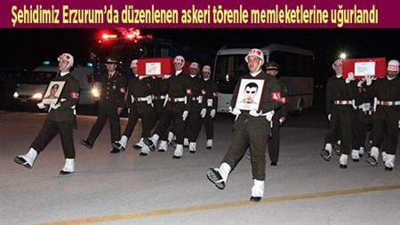 Agri’nin Dogubayazit ilçesinde patlayici yüklü traktörle jandarma karakoluna düzenlenen intihar saldirisinda sehit düsen iki asker, Erzurum’da düzenlenen askeri törenle memleketlerine ugurlandi.Agri’nin Dogubayazit ilçesinde patlayici yüklü traktörle jandarma karakoluna düzenlenen intihar saldirisinda sehit düsen iki asker, Erzurum’da düzenlenen askeri törenle memleketlerine ugurlandi.Saldirida sehit düsen askerlerden Adiyaman nüfusuna kayitli Medet Mat ile Siirt nüfusuna kayitli Mansur Cengiz, Agri’dan otopsi için Erzurum Adli Tip Kurumu’na gönderildi. Yaklasik dört saat süren otopsinin ardindan Türk bayragi üzerlerine örtülü sehitlerin cenazesi askeri havaalanina getirildi. Burada sehitler için askeri tören düzenlendi. Törene; AK Parti Erzurum Milletvekili Ibrahim Aydemir, Erzurum Vali Yardimcisi Ersin Boylu, Büyüksehir Belediye Baskan vekili Eyüp Tavlasoglu ve askeri erkan katildi. Sehitlerin özgeçmislerinin okundugu törende dua edilerek, daha sonra askeri uçakla sehit Medet Mat’in cenazesi Adiyaman’a, sehit Mansur Cengiz’in cenazesi de Siirt’e gönderildi.