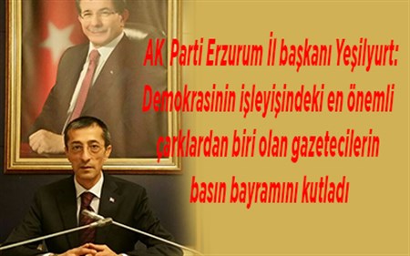Erzurum AK Parti Il Baskani Fatih Yesilyurt, Basinda sansürün kaldirilisinin 107’inci yildönümü (24 Temmuz 1908) sebebiyle bir mesaj yayinladi.Erzurum AK Parti Il Baskani Fatih Yesilyurt, Basinda sansürün kaldirilisinin 107’inci yildönümü (24 Temmuz 1908) sebebiyle bir mesaj yayinladi.Yesilyurt mesajinda su ifadelere yer verdi;“Basinimiz yazili, isitsel ve görsel kanallar araciligi ile yasadigimiz bölge ve tüm dünyadaki gelismeler hakkinda bilgi sahibi olunmasi, vatandas ile devlet arasindaki iletisimin saglanmasi ve kamuoyu olusturulmasi gibi birçok önemli görev ve sorumluluklari üstlenmektedir.Demokratik yasamin vazgeçilmez unsurlarindan biri olan haber alma ve yayma özgürlügünün en etkili araci olan basinin demokrasinin isleyisindeki en önemli çarklardan biri oldugunu ifade etti. Günümüzde hizla gelisen kitle iletisim araçlari ile birlikte etkinligi her geçen gün artan basin kuruluslari, haberlesme özgürlügünün kullanilmasinda önemli rol oynamaktadir. Süphesiz, dogru bilgilendirilmis çagdas bir toplum için basinin güvenilirligi ve tarafsizligi büyük önem arz etmektedir. Zor kosullarda, büyük bir özveriyle görevlerini yerine getiren basin mensuplarinin “24 Temmuz Basin Bayrami”ni içtenlikle kutluyor, saglik, mutluluk ve basarilar diliyorum”