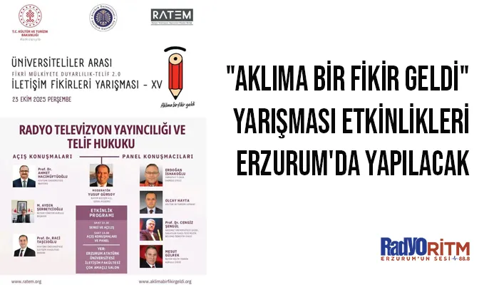 Radyo Televizyon Yayıncıları Meslek Birliği (RATEM) tarafından Kültür ve Turizm Bakanlığı katkıları ile düzenlenen üniversiteler arası "Aklıma Bir Fikir Geldi" adlı ve "Fikri Mülkiyete Duyarlılık Telif 2.0" amaçlı İletişim Fikirleri Yarışması etkinliklerinin üniversiteler bölümü ilk durağı Erzurum Atatürk Üniversitesi'nde 23 Ekim 2025 Perşembe günü gerçekleşecek.