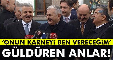 Basbakan Binali Yildirim, cuma namazini Emek Merkez Camii'nde kildi. Namaz sonrasi kameralarin karsisina geçen Yildirim, gazetecilerin sorularini cevapladi.Bir gazetecinin, Milli Egitim Bakani Ismet Yilmaz’i kastederek, “Sizin karneniz nasil?” diye sormasi üzerine Yildirim, “Onun karneyi ben verecegim, daha doldurmadim” cevabini verdi. Yildirim’in bu ifadeleri gülüsmelere neden oldu.Basbakan Binali Yildirim, cuma namazini Emek Merkez Camii’nde kildi. Karnelerini alan çocuklar, Basbakan Yildirim’in camiden çikisini bekledi. Yildirim, çocuklari öperek onlara satranç ve oyuncak hediye etti, ardindan ise çocuklarla birlikte hatira fotografi çektirdi. Basbakan Yildirim’in daha sonraki duraklari ise taksiciler ve çay salonu oldu. Burada vatandaslarla sohbet eden Yildirim, vatandaslarin sorunlarini dinledi. Basbakan Yildirim’a Milli Egitim Bakani Ismet Yilmaz da eslik etti.Basbakan Yildirim, tüm bu ziyaretlerin öncesinde gazetecilerin sorularini cevapladi. Bugün ögrencilerin karnelerini almasinin hatirlatilmasi üzerine Yildirim, sözü Milli Egitim Bakani Ismet Yilmaz’a birakti. Ögrencilere basarilar dileyen Yilmaz, “Tatilde tatil yapsinlar. Insallah, kendilerini kültürel, sanatsal ve sosyal yönden gelistirecek etkinliklerde yer alsinlar. Kitap okusunlar, sinemaya gitsinler, ailesiyle beraber bir huzur evini ziyaret edebilirler, bir tarihi ve kültürel edebilirler. Ankara’da Haci Bayrami ziyaret edebilirler. Anitkabir’i ziyaret edebilirler” diye konustu.Yilmaz, konusmasini söyle sürdürdü: “O karne ögrencilerle birlikte bize de verildi, yani Milli Egitim Bakanina da verildi. Varsa eksiklikler, kusurlar o bizim kusurlarimizdir. Dolayisiyla velilerin de bunu dikkate almalarini rica ediyorum.”Bir gazetecinin, “(Milli Egitim Bakani) Sizin karneniz nasil?” diye sormasi üzerine Basbakan Yildirim, “Onun karneyi ben verecegim. Daha doldurmadik” ifadelerini kullandi. Yildirim’in bu sözleri gülüsmelere neden oldu.