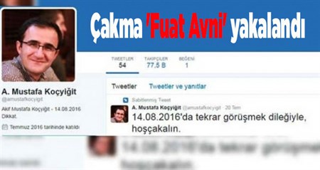 Fuat Avni hesabini yönettigi iddia edilen Basbakanlik Uzmani A. Mustafa Koçyigit ismiyle açilan çakma Twitter hesabindan, “14.08.2016'da tekrar görüsmek dilegiyle, hosçakalin” seklinde atilan mesajin Kahramanmaras'in Elbistan ilçesinden atildigi ortaya çikti.Mustafa Koçyigit ismi ile açilan sahte hesaptan atilan tweetler üzerine yapilan incelemede, mesajlarin ayni hesaptan atildigi belirlendi. IP numarasi üzerine yogunlasan Elbistan Cumhuriyet Bassavciligi, Akincilar Üssü’nde astsubay olarak görev yapan ve Elbistan’da olan M.Ü. ile kardesi F.Ü.’ye ulasti. Bassavciligin talimati ile gözaltina alinan kardeslerden F.Ü.’nün emniyetteki ifadesinde tweetleri kendisinin attigini kabul ettigi belirtildi.FETÖ/PDY’ye yönelik sorusturma kapsaminda gözaltina alinan F.Ü.’nün emniyetteki islemlerin ardindan adliyeye çikarilacagi ifade edildi