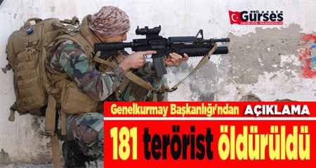 Genelkurmay Baskanligi, Cizre ve Silopi'de süren operasyonlarda toplam 181 teröristin etkisiz hale getirildigini açikladi.Genelkurmay Baskanligi’ndan yapilan açiklamada, Sirnak Cizre’de devam eden operasyonda; 1 bölücü terör örgütü mensubu gözaltina alindigi belirtilerek operasyonda, toplam etkisiz hale getirilen terörist sayisinin 160 oldugu kaydedildi. 93 adet hafif silah fisegi ele geçirildigi kaydedilerek 8 adet el yapimi patlayici imha edildigi ve 22 barikatin kaldirildigi ifade edildi.Sirnak Silopi’de devam eden operasyonda; 1 bölücü terör örgütü mensubu ölü, 4 bölücü terör örgütü mensubu sag olarak ele geçirildigi vurgulanarak operasyonda, toplam etkisiz hale getirilen terörist sayisinin 21 oldugu belirtildi. Bir adet el bombasi, iki adet tabanca, 9 adet av tüfegi ele geçirildigi kaydedilerek 15 adet el yapimi patlayici imha edildigi bildirildi.Diyarbakir Sur’da devam eden operasyonda; 1 bölücü terör örgütü mensubu terörist etkisiz hale getirildigi kaydedilerek 3 adet el yapimi patlayici imha edildigi ve 4 barikatin kaldirildigi belirtildi.Mardin Dargeçit’te devam eden operasyonda; 6 adet kalesnikof piyade tüfegi, 15 adet piyade tüfegi sarjörü, 1.730 adet piyade tüfegi fisegi, 24 adet roketatar mühimmati, 20 adet roketatar sevk fisegi, 30 bidon el yapimi patlayici (iki ton), 14 adet el bombasi, el yapimi patlayici haline getirildigi ifade edilerek 10 adet voleybol topu, bir adet av tüfegi, üç adet telsiz, çok sayida pil, kablo ve ilk yardim malzemesi ele geçirildigi bildirildi.Sirnak Uludere’de yapilan operasyonda, bir adet Bixi makineli tüfek, üç adet Kalesnikof piyade tüfegi, iki adet Keskin Nisanci tüfek dürbünü, 42 adet Kannas Keskin Nisanci tüfek bos sarjörü, 615 adet Kannas Keskin Nisanci tüfek fisegi, 240 adet Bixi makineli tüfek fisegi ve 5 adet anti personel mayini ele geçirildigi kaydedildi. Van Edremit kirsalinda, iki adet Kalesnikof piyade tüfegi, 5 adet piyade tüfegi sarjörü, 113 adet piyade tüfegi fisegi ve iki adet el yapimi patlayici ele geçirildigi ifade edildi.Mardin Nusaybin Duruca Mahallesinde, 06 Aralik 2015 tarihinde saat 16.00’da, taktik tekerlekli zirhli aracina el yapimi patlayici ile saldirida bulunulmasi ve araç içerisinde bulunan 6 personelin yaralanmasi olayinin faili 2 bölücü terör örgütü mensubu terörist yakalanarak tutuklandigi bildirildi.
