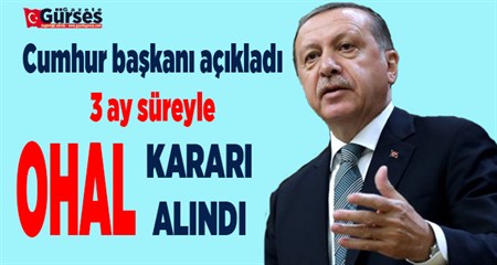 Cumhurbaskani Erdogan Bakanlar Kurulu karariyla 3 ay süreyle olaganüstü hal ilan edilmesinin kararlastirildigini açikladi.MGK ve Bakanlar Kurulu toplantilarinin ardindan basin mensuplarinin karsisina geçen Cumhurbaskani Erdogan, FETÖ üyesi olduklari anlasilan bu grup uçaklarla, tanklarla devlete ve millete karsi saldiriya geçmistir. Milletimizin iradesine sahip çikmasi karsisinda darbecilerin tanklari, silahlari ise yaramamistir. Milletimizin tüm fertleri darbeciler karsisinda tek vücut olmustur. MGK’da darbe girisimin tüm unsurlariyla bertaraf edilmesi için olaganüstü hal ilan edilmesini tavsiye karari aldik. Bakanlar kurulumuz 3 ay süreyle olaganüstü hal ilan edilmesini kararlastirdi. Bu uygulama kesinlikle demokrasiye, hukuka ve özgürlüklere karsi degildir.Tam tersine bu, degerleri koruma ve güçlendirme amacina yöneliktir. Demokrasiden asla taviz vermedik bundan sonra da asla vermeyiz. TSK hükümetin emrindedir. Baskomutan olarak bizler de askerimizle birlikte TSK’nin içindeki bütün virüsleri temizleyecegiz” dedi.