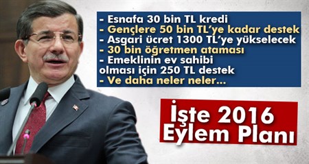 Basbakan Ahmet Davutoglu 64. Hükümet, 2016 yili eylem planini açikladi.Basbakan Ahmet Davutoglu, 64. Hükümet 2016 yili eylem planini açikladi. Basbakan Davutoglu konusmasina söyle basladi:Dünyanin her tarafinda alnimiz ak daha güçlü Türkiye için çalisiyoruz. Çevremizdeki yangina ragmen verdigimiz sözleri tutmak için çalisiyoruz. Seçimden önce verdigimiz sözleri bugün açiklayacagimiz eylem plani ile hayata geçiriyoruz. Temel hedefimiz güçlü bir Türkiye insa etmektir. Güven duygusunu zedeleyecek hiçbir adim atmayacagiz. Seçimden önce verdigimiz sözleri hayata geçirecegiz. Bugünden baslayarak yeni bir sayfa açiyoruz. Cumhurbaskanimiz herkesi çetele tutmaya çagirmisti. Sizlerden verdigimiz hangi sözü ne zaman gerçeklestirdigimizi görmenizi istiyoruz. Eylem planimizi milletimizin istekleri dogrultusunda hazirladik.Iste 1 hafta içerisinde yapacaklarimiz:Bakanlar kurulu karariReform grubu olusturagizGençlerimize 50 bin TL’ye kadar destekGençlerimize 100 bin TL’ye kadar kredi sürecini baslatacagiz.Lisans ögrencilerinin aldigi 350 TL’lik krediyi 400 TL’ye çikardikEvliligin tesviki amaciyla destek saglayacagizEsnafimiza 30 bin TL kredi destegiIsletme büyüklügü 5 dönümün altinda olan bitki yetistiricilerine faizsiz krediSeracilik maliyetini düsürecegizVaatlarin bütününü ilk 3 ay içerisinde hayata geçirecegiz. Bunlari ekonomik ve sosyal alanda yogunlastirdik.3 ay içerisinde gerçeklestireceklerimiz vaatlerimiz:Asgari ücreti 1300 TL’ye yükseltecegiz. Isverenlerimizin rekabet gücünü zarara ugratmayacagiz. KOBI’lerimizin etkilenmemesi için gerekli tedbirleri alacagiz.BagKur ve emekli sandigi emeklilerine sigorta kesitini kaldiracagiz65 yasindaki yaslilarimizin maaslarinda kesinti olmayacakMuhtarlarin 950 TL olan maaslarini 1300 TL olacakPolislerimizin ek göstergelerini 3 bin TL’ye çikariyoruz.Astsubay emeklilerin sorunlarini çözüyoruz. Askeri ögrencilerin harçligini 400 TL’ye çikariyor. Er ve Erbaslarimizin maasini 100 TL’ye çikariyoruz.30 bin yeni ögretmen atamasini yapiyoruz.Konut hesabi uygulamasini baslatiyoruz. Yüzde 25 pesinati olan vatandaslarimiza yüzde 15 destekEmeklilerimizi ev sahibi yapmak için 250 TL’ye ev destegi yapiyoruz.Dogum nedeniyle ücretsiz izinlerin düzenleyecegiz.Çalisanlarin doguma bagli olarak ilk çocuga 2 ay yari zamanli çalisacak.Yoksul ailelere belirli ölçülerde internet erisimi saglayacagiz.Kentsel dönüsüm yapilmasi sartiyla izinsiz yapilara elektrik ve su saglayacagiz.Tarihimizin önemli sahsiyetlerin tanitimini saglayacagiz.Mültecilerin ise her zaman yanlarinda olacagiz. Masum çocuklarin etnigi dini yoktur. Çocuklara zülm edenler en büyük insanlik suçunu islemistir. Yetimlere sahip çikmak Peygamberimizin bize emridir.Kültür faaliyetlerimizle ilgili hem geleneksel hem de çagdas sanatlari destekleyecegiz.Gurbette olan vatandaslarimizin taleplerini tek tek aldik. Orada ne söz verdiysek yerine getirdik getirecegiz. Yurtdisinda yasayan vatandaslarimizin askerlik bedellerini 6000 Euro’dan 1000 Euro’ya düsürüyoruz.Her bir KOBI için kefalet limitini yükseltiyoruz.Küçük esnafimiz için yillik 8 bin TL’den hesaplanan vergilerini almayacagiz.Ilk is bulan her gencimizin ücretini 1 yil devlet ödeyecek.GSS’yi sifirliyoruz.Lise veya üniversiteli gençlerimizin GSS primlerine destek saglayacagiz.Gençlere ücretsiz internetYeni is kuran gençlerimize 3 yil boyunca gelir vergisi muafiyeti saglayacagiz.Genç-Des programini hayata geçirecegizKisa film dergi kitap gibi projelere destek verecegiz.Gençlerimizin pasaport harcini kaldiracagiz.Yem de ve gübrede KDV’yi kaldiriyoruz.Sembolik bir kira bedeliyle girisimcilerimizi fabrika sahibi yapacagiz.Elektronik TC kimlik kartini vatandaslara dagitacagiz.Bu vaatlerin tamamini 3 ay içinde hayata geçirecegiz.Bu vaatlerin disinda reform paketlerini de hazirladik. 2016 yili için 1 yil, 3 ay ve 1 aylik eylem plani taslagi hazirladik.Adalet terazisinin sasmasina asla izin vermeyecegiz.Ilk 3 aylik reformlariTemel hak ve hürriyetler reform paketiDarbe dönemlerinden kalan mevzuattaki anti demokratik hükümler kaldirilacak. Cem Evlerine hukuki statü taninacak.Kamu yönetimi seffaflik paketiSiyasi etik kanunu çikarilacakImar plani degisiklikleri sonucunda kamunun pay almasi saglanacakAsil islerde çalisanlarin kamuda istihdami saglanacakÖnemli bir husus. Bilirkisilik müessesini yeniden ele alacagiz.Is mahkemelrim yagisi gözden geçirilecek.Ülke genelinde ideal yargilama süreleri belirlenecek.Vatandaslarimiz kamu kurumlarina gitmeden islemlerini yapacak.Egitim reformu paketi çerçevesinde egitim fakülteleri yeniden ele alinacak.Mezunlarin kalitesine özel önem verilecek.Organiza Sanayi Bölgeleri disinda açilan yerler tesvik edilecek.Gümrüklerde tek pencere sistemi uygulanacak.Binalarda enerji verimliligi desteklenecek.Yatirimlarda bürokrasinin azaltilmasi tedbirleri arttirilacak.Sirketlerin kurusul islemleri kolaylastirilacak.Isyeri açma basitlestirme saglanacak.Patent kanunu çikarilacakTürkiye uzay ajansi açilacakTurkuaz kar sistemi için hazirliklar tamamlanacak. Vasifli yabanci uyruklu çalisanlar burada çalisabilecek.Çevre yerel yönetimler ve kentsel dönüsüm paketi çerçevesinde büyüksehir gelirleri arttirilacak.Kentsel dönüsüm alanlarini devredilebilecekSehirlerde kisi basi yesil alan ortami arttirilacak.1 YILLIK REFORM PAKETIDemokratiklesme paketi baglaminda yeni seçim kanunu ve devlet sirri kanunu çikarilacakVatandaslarimizin daha kolay adalet hizmeti alabilmesi için hukuki yardim hizmetini baslatacagiz.Ani bir olay karsisinda adalete basvurmak istediginde cebinde avukata para ödeyecek parasi olmayan vatandas adalete kolaylikla ulasabilecek.Merkezi idare ve yerel yönetimler yeniden düzenlenecek.Aile Sosyal Destek programinin alt yapisi saglanacak.Sosyal yardim kanunu çikarilacakInsanlarimizin mahkemeye gelmeden de meselelerini çözecek.Is uyusmazliklari hakem h