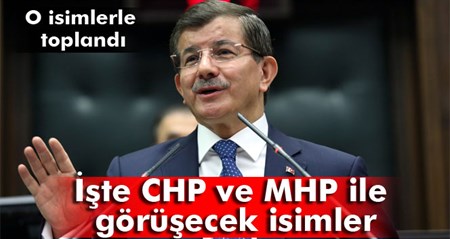 Basbakan Ahmet Davutoglu, AK Parti'nin CHP ve MHP ile koalisyon çalismalarini yürütmek üzere olusturdugu heyetteki isimlerle bugün iki ayri toplanti gerçeklestirdi.Basbakanlik Kaynaklari’ndan alinan bilgiye göre, AK Parti’nin CHP ve MHP ile koalisyon çalismalarini yürütmek üzere olusturdugu heyetteki isimlerle bugün Basbakanlik Resmi Konutu’nda iki ayri toplanti gerçeklestirdigi belirtildi. Basbakan Davutoglu baskanliginda bugün ögleden sonra gerçeklestirilen toplantilarda koalisyonlarla ilgili kurulan komisyon üyelerinin yürütülen çalismalarin ardindan hazirlanan raporlari Basbakan Davutoglu’na sundugu vurgulandi.Toplantilarin ilkinde CHP ile ilgili çalismalari yürüten komisyon üyelerini toplayan Davutoglu, beyanname, vaatler, koalisyon görüsmeleri sürecinde takip edilecek metot ve diger detaylar konusunda degerlendirmelerle hakkinda görüs alisverisinde bulundu. CHP ve MHP’nin seçim beyannamesi, tüzük ve programi incelendi. AK Parti ile ortak noktalar ve ayrisan hususlar ayri ayri tespit edildi.ISTE CHP VE MHP HEYETINDE YER ALACAK ISIMLERCHP ile ilgili toplantiya heyette yer almasi beklenen Basbakan Yardimcisi Numan Kurtulmus, Kültür ve Turizm Bakani Ömer Çelik, Kalkinma Bakani Cevdet Yilmaz, Ulastirma, Denizcilik ve Haberlesme eski Bakani Lütfi Elvan, AK Parti Genel Baskan Yardimcisi Hüseyin Çelik, AK Parti Ankara Milletvekili Mücahit Aslan ve AK Parti Malatya Milletvekili Taha Özhan komisyon üyeleri olarak katildi.MHP heyetinde ise Çalisma ve Sosyal Güvenlik Bakani Faruk Çelik, Enerji ve Tabii Kaynaklar Bakani Taner Yildiz, Kalkinma Bakani Cevdet Yilmaz, Ulastirma, Denizcilik ve Haberlesme eski Bakani Lütfi Elvan, AK Parti Trabzon Milletvekili Süleyman Soylu, AK Parti Grup Baskanvekilleri Mahir Ünal, Naci Bostanci, Mustafa Elitas, AK Parti Genel Baskan Yardimcisi Salih Kapusuz, AK Parti Ankara Milletvekilleri Vedat Bilgin, Ertan Aydin yer aldi.Cevdet Yilmaz, Lütfi Elvan ve AK Parti Genel Baskan Danismani Ali Sarikaya iki toplantiya da katildi.