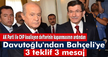 AK Parti ile CHP arasinda koalisyon defteri kapandi. Davutoglu-Bahçeli görüsmesinden çikacak sonuç, siyasetin rotasini çizecek.AK Parti ile CHP arasinda koalisyon defterinin kapanmasinin ardindan Baskent, yarin yapilacak Davutoglu-Bahçeli görüsmesine odaklandi. Görüsmeden çikacak sonuç, siyasetin rotasini çizmesi bakimindan önem tasiyor. Basbakan Ahmet Davutoglu, MHP Lideri Devlet Bahçeli ile görüsmeye üç mesaj ve üç teklifle gidecek.Davutoglu’nun, su teklifleri gündeme getirecegi kaydediliyor:– Davutoglu, Bahçeli’ye CHP’ye de sundugu “sinirli süreli koalisyon” önerisi ile gidecek. Eger Bahçeli bu fikre sicak bakarsa, 23 Agustos’a kalmadan gereken adim atilacak. Ancak Bahçeli’nin sergiledigi tavir dolayisiyla bu ihtimalin güçlügüne dikkat çekiliyor.– Seçime endeksli bir azinlik hükümeti kurulmasi ve belli bir takvim içinde seçime gidilmesi, önerilerden biri olacak. Bahçeli’nin daha önce sicak bakmadigi bu öneriye, yeni tablo karsisinda nasil bir cevap verecegi bekleniyor. Kulislerde, bu ihtimalin de düsük oldugu belirtiliyor.– Zaman geçirilmeden, Ekim’de erken seçim yapilmasi. Bu konuda da 18 veya 25 Ekim önerisinde bulunulacak. Seçime, mevcut hükümetle gidilmesi öngörülüyor.Davutoglu’nun görüsmede gündeme getirecegi belirtilen hassasiyetler söyle siralaniyor: – Seçim ve hükümet kararini Cumhurbaskani’na gitmeden biz verelim, “Gerekirse üç lider bir araya gelelim ve ortak bir tarih belirleyerek bu dönemi asalim” mesaji verecek.– Bizim ne yapacagimizi degil, sizden sizin ne yapmak istediginizi ögrenmeyi bekliyoruz.– Davutoglu, “Saraya sirtini dönsün” diyen Bahçeli’ye, “Bizim Sayin Cumhurbaskanimizla görüs ayriligimiz yok. Uyum içinde çalismayi sürdürecegiz” mesajini verecegi kaydediliyor.
