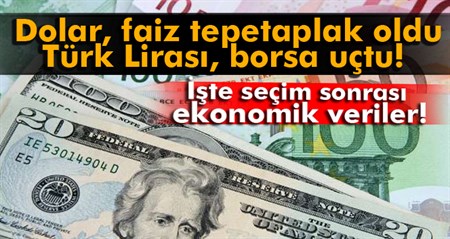 2 yillik gösterge tahvilin faizi yüzde 10'un altina geriledi.Türk Lirasi, AK Parti'nin tek basina iktidara geldigi seçimin ardindan dolar karsisinda yüzde 5'e yakin deger kazandi. Dolar, 2.78'in altina indi. Borsa ise, Istanbul yüzde 5,35 yükselisle 83 bin 653 puandan açildi.FAIZ TEK HANEYE DÜSTÜDolarin TL karsisindaki düsüsün ardindan Cuma günü 10,18 seviyesinden kapanan 2 yillik bilesik faiz 9,67’ye geriledi. Cuma günü 9,77’den kapanan 10 yillik tahvil bilesik faiz de 9,24’e geriledi.DOLAR 2,80’IN ALTINDATürk Lirasi, AK Parti’nin tek basina iktidara geldigi seçimin ardindan dolar karsisinda yüzde 5’e yakin deger kazandi. Dolar, 2.78’in altina indi.Siyasi istikrarin saglanmasi ile Türk Lirasi yeni haftaya hizli basladi. TL, dolar karsisinda yüzde 5’e yakin deger kazandi. Bankalararasi piyasada güne 2,8250 seviyesinden baslayan dolar kuru 2,7744 seviyesine kadar indi. Kur, cuma günü son islemde 2.9095 seviyesindeydi. Euro da benzer oranda bir düsüsle 3,0617 TL’ye geriledi.BORSA UÇTU!Borsa Istanbul yüzde 5,35 yükselisle 83 bin 653 puandan açildi. AK Parti’nin seçim neticesinde tek basina iktidar olmasi ve siyasi istikrarin saglanmasinin etkisiyle Borsa Istanbul (BIST) 100 Endeksi açilista yüzde 5,35 yükseldi. Endeks 83 bin 653 puan oldu. Borsanin 14 Temmuz’dan bu yana gün içi en yüksek puani oldu.