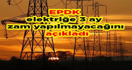 Enerji Piyasasi Düzenleme Kurulu (EPDK), 3 ay boyunca elektrige zam yapilmayacagini açikladi.Enerji Piyasasi Düzenleme Kurumunca (EPDK) Temmuz, Agustos ve Eylül aylarini kapsayan gelecek 3 aylik dönemde elektrik fiyatlarinda artis olmayacagi bildirdi. EPDK’dan yapilan açiklamada, 1 Temmuz’dan geçerli olmak üzere gelecek 3 ay için perakende elektrik satis tarifelerinde herhangi bir degisiklik yapilmayacagi ifade edildi.Abonelerin, 1 Temmuz’dan itibaren geçerli olacak tarife tablolarina kurumun internet sitesinden ulasabileceginin belirtildigi açiklamada, sunlar kaydedildi: “Mesken abonesinin 100 kilovatsaat için ödeyecegi vergi ve fonlar dahil toplam tutar, Ocak-Haziran aylarinda oldugu gibi Temmuz-Eylül aylarinda da yaklasik 41 lira olacak.”