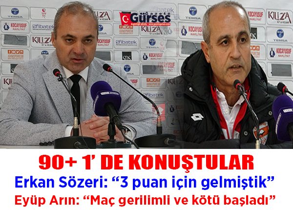 Maçin ardindan gazetecilere açiklamalarda bulunan Sözeri, “Hesapta yoktu. Maça çok iyi basladik. Sezonun en iyi maç baslangicini yaptik. 10 dakikada 3-4 gol atabilecek pozisyonlara girdik. Bunlari atamazsaniz kisir bir sonuçla karsi karsiya kaliyorsunuz. Çok üzgünüz tabii. Buraya 3 puan için gelmistik. Onu da oynadigimiz oyun girdigimiz pozisyonlarla gösterdigimizi düsünüyorum. Oyuncularim çok gayretliydiler. Sonuçta berabere kaldik. Artik önümüzde ki Bursaspor maçina odaklanacagiz. O maçi içeride kazanip ortalama 2 puanimizi devam ettirmek en büyük amaç” diye konustu.Eyüp Arin: “Maç gerilimli ve kötü basladi”