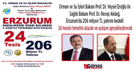 Orman ve Su Isleri Bakani Prof. Dr. Veysel Eroglu ile Saglik Bakani Prof. Dr. Recep Akdag, 13 Agustos Cumartesi günü saat 11.00’da Erzurum’da düzenlenecek olan toplu temel atma ve açilis merasiminde 206 milyon liraya mal olacak 24 adet tesisin temelini atacak ve açilisini gerçeklestirecek.Prof. Dr. Veysel Eroglu ile Prof. Dr. Recep Akdag Erzurum programi kapsaminda ilde Devlet Su Isleri (DSI) Genel Müdürlügü tarafindan insa edilecek 19 adet tesisin ve Orman Genel Müdürlügü (OGM)’nce yapilacak 1 adet tesisin temelini atacak ve DSI Genel Müdürlügü tarafindan insa edilen 4 adet tesisin de açilisini gerçeklestirecek. Prof. Dr. Veysel Eroglu ayrica programi çerçevesinde Erzurum’a yapilmasi planlanan 822 milyon TL yatirim bedeline sahip 76 müjdeyi de açiklayacak. Erzurum’a 206 Milyon TL’lik 24 Tesis Orman ve Su Isleri Bakani Prof. Dr. Veysel Eroglu ile Saglik Bakani Prof. Dr. Recep Akdag saat 14.00’da Yakutiye Kent Meydani’nda düzenlenecek toplu temel atma ve açilis merasiminde DSI tarafindan insa edilecek Senkaya Tütenocak, Oltu Sendurak, Merkez Karagöbek, Senkaya Sariyar, Uzundere, Ispir Maden Köprübasi Barajlari, 2 adet gölet, 1 adet sulama ile 14 adet taskin koruma tesisinin temelini atacak. Ayrica OGM tarafindan yapilacak agaçlandirma ve ormancilik projelerini de açiklayacaklar. Iki bakan ayni merasimde DSI Genel Müdürlügü tarafindan yapimi tamamlanan 4 adet taskin koruma tesisini de hizmete alacak ayrica Erzurum’da 20 aileye süt sigirciligi, süt koyunculugu, seracilik, fenni aricilik, günes enerjisi ve gelir getirici türler için Orköy sertifikasi verecek. 132 Bin 190 Dekar Zirai Arazi Suya Kavusacak Bakan Prof. Dr. Veysel Eroglu ve Prof. Dr. Recep Akdag tarafindan temeli atilacak tesislerle 132 bin 190 dekar zirai arazi suya kavusacak. Ayrica 3 ilçe, 44 yerlesim yeri ve 136 bin dekar zirai arazi taskin zararlarindan korunacak. Erzurum’a 822 Milyon TL’lik Yatirim Saganagi Orman ve Su Isleri Bakanligi, 2016 yilini Erzurum’da yatirimlarda hamle yili ilan etti. Prof. Dr. Veysel Eroglu da programi çerçevesinde Erzurumlulara 822 milyon lira yatirim bedeline sahip 76 müjde müjde verecek. Müjdeler arasinda baraj, sulama tesisleri, taskin koruma tesisi, fidan üretimi, gelir getirici tür agaçlandirma, orman köylülerine kredi, Nene Hatun Tarihi Milli Parki Erzurum Kültür Sokagi çalismalarinin tamamlanmasi, Nene Hatun Tarihi Milli Parki 3 Sehitlik ihyasi ve 3 adet otomatik meteoroloji gözlem istasyonunun (OMGI) kurulumu yer aliyor.
