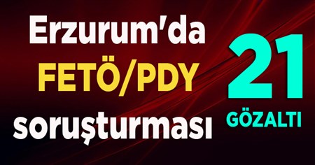 Erzurum'da, Fetullahçi Terör Örgütü/Paralel Devlet Yapilanmasina (FETÖ/PDY) yönelik sorusturma kapsaminda 21 kisi gözaltina alindi.Alinan bilgiye göre, Erzurum Cumhuriyet Bassavciliginca yürütülen FETÖ/PDY sorusturmasi kapsaminda bugün sabah saatlerinde operasyon düzenlendi. Operasyon kapsaminda gözaltina alinan 21 kisi hakkinda tahkikat baslatildi.