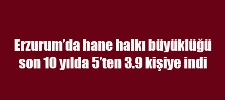 Erzurum’da hane halki büyüklügü son 10 yilda 5’ten 3.9 kisiye indi. Ilde ekonomik refah düzeyinin artisi beraberinde ayni hanede yasayan kisi sayisinin da düsüs göstermesini sagladi. Ata erkil yapi terkedilirken, ekonomik bagimsizliga erisen, ya da evlenenler ayri evlerde yasamayi tercih eder oldu. Kentsel dönüsümle konut sayisinda kaydedilen artis da hane halki büyüklügü azalmasini sagladi.TÜIK ADNKS VERILERI TÜIK 2017 ADNK verileri bazinda, Erzurum ortalama hanehalki büyüklügü, 2008-2017 verilerini paylasti. Erzurum’da Hane halki büyüklügü 2008 yilinda 5.0, 2009 yilinda 4.9, 2010 yilinda 4.8, 2011 yilinda 4.7, 2012 yilinda 4.6, 2013 yilinda 4.4, 2014 yilinda 4.2, 2015 yilinda 4.1, 2016 yilinda 4.0 ve 2017 yilinda da 3.9 kisi olarak ölçüldü. DOGU ANADOLU VE ERZURUM Dogu Anadolu Bölgesinde hane halki büyüklügünün en az oldugu 3 il Tunceli, Erzincan ve Ardahan, en yüksek oldugu 3 il ise Agri, Van ve Hakkari olarak kaydedildi. Hane halki ortalama büyüklügü Tunceli’de 2.7, Erzincan’da 3.1, Bayburt ve Ardahan’da 3.4, Elazig’da 3.5, Malatya7da 3.6, Erzurum ve Bingöl’de 3.9, Kars’ta 4, Igdir’da 4.3, Bitlis’te 4.8, Mus’ta 5.1, Van ve Agri’da 5.2, Hakkari’de 5.7 kisi oldu.