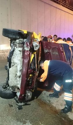 Erzurum’da bir ticari taksinin yan yatmasi sonucu araç içerisinde sikisan iki kisi yaralandi.Edinilen bilgiye göre, olay dün aksam saat 22.00 siralarinda Erzurum Bölge Egitim ve Arastirma Hastanesi alt geçitinde meydana geldi. Iddiaya göre alt geçite asiri süratle giren 25 T 0125 plakali ticari taksi, yan yatti. Hurdaya dönen otomobilde sikisan iki kisi olay yerine sevk edilen AFAD ve Itfaiye ekiplerince sikistiklari yerden çikarildi. 112 Acil saglik ekiplerince Erzurum Bölge Egitim ve Arastirma Hastanesi’ne kaldirilan yaralilar tedavi altina alindi.