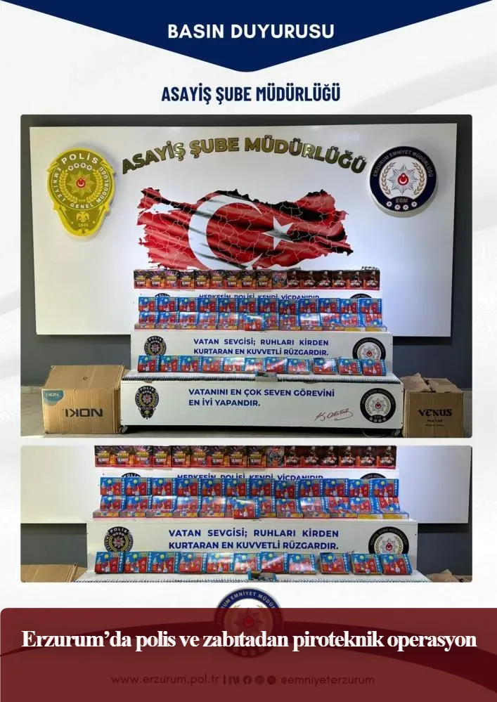 Erzurum İl Emniyet Müdürlüğünce yapılan açıklamada, "Halkımızın huzur ve sükunun tesisi için izin almadan piroteknik madde satışı yapan iş yerleri ve bunları satın alarak kullanmak suretiyle vatandaşlarımız arasında korku, kaygı ve panik oluşturan kişilere yönelik denetimlerimiz aralıksız devam edecektir" denildi.