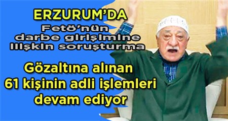 Erzurum'da, Fetullahçi Terör Örgütü/Paralel Devlet Yapilanmasi'na (FETÖ/PDY) yönelik sorusturmada gözaltina alinan 61 kisinin adli islemleri devam ediyor.Erzurum Cumhuriyet Bassavciligindan yapilan açiklamaya göre, FETÖ/PDY’ye yönelik sorusturma kapsaminda düzenlenen operasyonda, aralarinda polis, asker, ögretmen, doktor, infaz koruma memuru ve adliye personelinin de bulundugu 61 kisi gözaltina alindi. 2 kurmay albay, 3 üstegmen, 27 polis memuru, 4 adliye personeli, 8 infaz koruma memuru, 6 ögretmen, 2 doktor, 8 diger sahis ve cezaevinden sorumlu oldugu iddia edilen 1 memur olmak üzere toplam 61 süphelinin adli islemlerinin devam ettigi bildirildi.