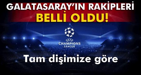 Süper Lig'de 2014/2015 sezonunu sampiyon olarak tamamlayarak Sampiyonlar Ligi'ne direkt olarak gitmeyi garantileyen Galatasaray'in rakipleri belli oldu.A GrubuParis Saint Germain Real Madrid Shakhtar DonetskB Grubu PSV Eindhoven Manchester United CSKA MoskvaC Grubu Benfica Atletico Madrid GALATASARAY AstanaD Grubu Juventus Manchester City SevillaE Grubu Barcelona B.LeverkusenF Grubu Bayern Münih Arsenal OlympiacosG Grubu Chelsea Porto Dynamo KievH Grubu Zenit Valencia O. Lyon
