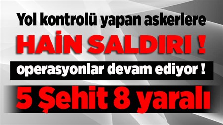 Hakkari'nin Çukurca ilçesinde PKK'li teröristler ile güvenlik güçleri arasinda çikan çatismada 5 asker sehit oldu ve 8 asker yaralandi.Edinilen bilgiye göre, Çukurca-Hakkari karayolunun Doganli bölgesinde yol kontrolü yapan askerlere PKK mensuplari tarafindan uzun namlulu silahlarla saldiri düzenlendi. Çikan çatismada 5 asker sehit olurken, 8 asker yaralandi. Bölgede hava destekli operasyon sürüyor.