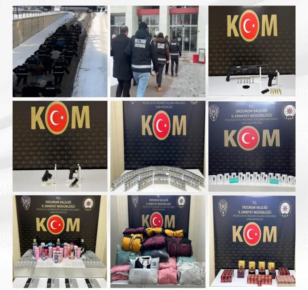 01.01.2026-01.02.2026 tarihleri arasında Kaçakçılık Ve Organize Suçlarla Mücadele Şube Müdürlüğü ekipleri tarafından Erzurum ili genelinde Şube Müdürlüğü konularına giren suçlar kapsamında; 30 planlı ve münferit operasyon düzenlendi. 115 şahıs hakkında adli tahkikat başlatıldı. Adli tahkikat başlatılan şüphelilerin 19'u hakkında adli kontrol şartı uygulanırken, 24 şüpheli tutuklanarak cezaevine teslim edildi.