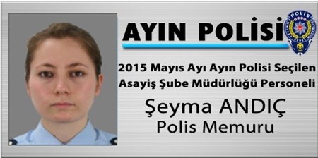 Erzurum’da agresif hareketler sergileyen ve üzerini aratmamak için direnen süpheli sahsin belindeki tabancayi alarak etkisiz hale getiren kadin polis memuru Seyma Andiç, ayin polisi seçildi.Erzurum’da agresif hareketler sergileyen ve üzerini aratmamak için direnen süpheli sahsin belindeki tabancayi alarak etkisiz hale getiren kadin polis memuru Seyma Andiç, ayin polisi seçildi. Erzurum Emniyet Müdürlügü tarafindan 2015 yili Mayis ayi Ayin Polisi Seyma Andiç, seçildi. Basarili çalismasi dolayisiyla ayin polisi seçilen Andiç, Il Emniyet Müdürü Kamil Karabörk tarafindan basari belgesiyle ödüllendirildi. Andiç’in ayin polisi seçilmesine neden olay söyle açiklandi: “26 Nisan 2015 tarihinde 155 Polis Imdat hattina gelen ihbarda, bir sahsin sürekli olarak üzerinde ruhsatsiz silah tasidigi, ikametinde 2 adet av tüfegi ile poset içerisinde sari renkli haplarin bulundugun ihbar edilmesi üzerine; ihbarda adi geçen sahsin ev ve is yerinde arama yapmak üzere alinan mahkeme kararina istinaden, Cinayet/Gasp Büro Amirligi görevlileri, arama yapmak üzere sahsin is yerine intikal ettiklerinde sahsin kapi önünde telefonla konustugu arama karari kendisine gösterildiginde agresif tavirlar sergiledigi ve üzerini aratmak istememesi üzerine sahis etkisiz hale getirilmek istendigi sirada Polis Memuru Seyma Andiç sahsin belindeki ihbara konu silahi fark ederek ani bir çeviklikle sahsin belindeki silahi alarak sahsi etkisiz hale getirmistir. Yakalanan sahis adli mercilere sevk edilerek tutuklanmistir. Bu itibarla Polis Memuru Seyma Andiç’in basarili çalismalarindan dolayi 2015 Yili Mayis Ayinin Polisi olarak seçilerek Basari Belgesi ile ödüllendirilmesi uygun görülmüstür.”