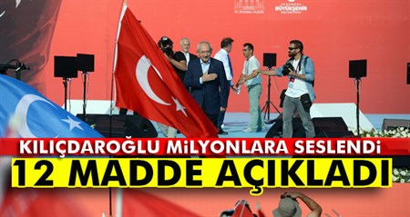 Yenikapi'da milyonlara seslenen CHP Genel Baskani Kiliçdaroglu, sürece dair hazirlamis oldugu 12 maddeyi açikladi.Sözlerine, “Bugün bizim demokrasi tarihimizin önemli bir günüdür” diyerek baslayan Kiliçdaroglu, “Bugün Türk siyasal hayati, demokrasi tarihinde önemli bir olaya imza attik. 15 Temmuz aksami, Türk Silahli Kuvvetleri içinde yuvalanan bir çete grubu, Türk demokrasisine darbe yapmak istedi. Parlamentoya darbe yapmak istedi. Daha dogrusu size, bize, hepimize darbe yapmak istedi. Öncelikle o gece Türkiye Büyük Millet Meclisi’ni sabaha kadar açik tutan, yöneten meclis baskanina yürekten tesekkürlerimi sunmak istiyorum. Parlamenter sistemimize karsi bir darbe yapmak istediler. Bizim cumhuriyet tarihimizin en kanli darbe girisimidir bu. 240 sehidimiz var. 240 aslanimizi topraga verdik. Onlari unutmayacagiz ve unutturmayacagiz” dedi.CHP Genel Baskani Kemal Kiliçdaroglu, Türkiye Büyük Millet Meclisi’nin sabaha kadar çalisarak darbecilere karsi dik durdugunu belirterek, “Meclis, sabaha kadar çalisarak, darbeciye karsi dik durarak sadece kendi onurunu degil, milletvekillerinin de onurunu korumustur. Parlamentoda grubu bulunan 4 siyasi partinin liderleri ve 4 siyasi partinin milletvekilleri darbeye karsi açik, net bir tavir koymuslardir. Darbeye karsi demokrasi bildirgesini hep beraber imzalamislardir. Gönül isterdi ki bu güzel toplantiya eslik etmek için sadece parlamentoda degil, parlamento disindaki genel baskanlar da burada olsaydi, son derece mutlu olurduk. Çünkü Gazi Mustafa Kemal, ‘söz konusu vatansa gerisi teferruat’ diyor. Bizim için söz konusu vatandir, sonuna kadar vatana sahip çikacagiz” diye konustu.15 Temmuz gecesi yasananlarin, bir uzlasma kapisi araladigini belirten Kemal Kiliçdaroglu, “Artik yeni bir Türkiye var. Eger biz bu gücü, bu uzlasma kültürünü daha da ileriye tasiyabilirsek, çocuklarimiza çok daha güzel bir Türkiye birakmis olacagiz. Önce teshisi dogru koyacagiz ki, tedaviyi dogru yapalim. Bir musubet bin nasihatten evladir. Ben dahil bütün siyasilerin bu musibetten ders çikarmasi lazim” açiklamasinda bulundu.CHP Genel Baskani Kiliçdaroglu, hazirladigi 12 maddelik yol haritasini söyle siraladi:“Camiye, askeriyeye kislaya siyaset, adliyeye sokmayalim. Camide siyaset olmayacak. Bizim soylu bir uzlasmaya ihtiyacimiz var. Bizim, kavga degil, milleti kardes kilmak gibi bir görevimiz var. Siyasette öz elestiri yapmak, geçmisi iyi tahlil etmemiz gerek. Bunu yapabilirsek, gelecekte çok daha güzel Türkiye’yi insa edebiliriz. Tarihi tekerrür ettirmemeliyiz. Milleti kardes kilma yolunda kararliligimizi sürdürmeliyiz. Devletin insasinda liyakat sistemini esas almaliyiz. Bu sistemden vazgeçmemeliyiz. Isi ehline verdigimiz zaman Türkiye çok daha güzel yönetilecektir. Garibanin oglu, sizin çocuklariniz KPSS’de beklerken, birileri sinav sorularini çalip ve devletin önemli yerlerine geliyorsa, buna hep beraber itiraz etmeliyiz. Her sartta, her kosulda demokrasiye sahip çikmaliyiz. 15 Temmuz, demokrasinin ne kadar önemli oldugunu bize gösterdi. 15 Temmuz’da halk direnme gücünü kullanarak, tanklarin önüne geçerek demokrasiyi savunmustur. Demokrasi üzerinde tüm vesayetleri reddetmeliyiz. Milletin üzerindeki her türlü gölgeye son vermeliyiz. Ne darbe, ne dikta yasasin tam demokrasi.”Cumhuriyetin kurucu degerlerine sahip çikilmasi gerektiginin altini çizen Kemal Kiliçdaroglu, “Mustafa Kemal ve arkadaslari cumhuriyeti kurarken bir anayasa yaptilar. Birinci madde; hakimiyet kayitsiz sartsiz milletin diyor. Hiçbir kimseye, hiçbir aileye, hiçbir gruba imtiyaz taninmiyor. Vatandaslar esittir, birliktedir. Kimligi ne olursa olsun, inanci ne olursa olsun bütün vatandaslar kanun önünde esittir. Cumhuriyetin esitlik degerlerine, hakimiyet kayitsiz sartsiz milletindir degerlerine hepimizin sonuna kadar sahip çikmasi gerekiyor. Cumhuriyet bilhassa kimsesizlerin kimsesidir. Cumhuriyet bizim alin terimizdir. Eger bugün cumhuriyet olmasaydi, Sayin Recep Tayyip Erdogan cumhurbaskani olamazdi, Sayin Kahraman meclis baskani olamazdi. Sayin Binali Yildirim Basbakan olamazdi. Anadolu’nun kus uçmaz köyünde dogan Kemal Kiliçdaroglu CHP’ye genel baskan olamazdi. Parlamenter sistemimizi güçlendirmek zorundayiz. Medyanin özgürlügü konusu çok önemli. 15 Temmuz aksami bagimsiz medya olmasaydi, belki hiç kimse sokaklara çikmayacakti. O medya olaylari verdi, vatandaslar sokaga davet edildi. O medya bütün bu görüntüleri verdi. Medya özgürlügünün bir diger önemi; biz siyasetçiyiz eksigimiz, yanlisimiz olabilir ama bunlari dile getirecek olan medyadir. Medyanin bagimsizligina siyasilerin saygi duymasi ve önem vermesi lazim. Yarginin tarafsizligi ve bagimsizligi çok önemli. FETÖ terör örgütü ordunun içinde yuvalandi, yarginin içinde yuvalandi, devletin her kademesinde yuvalandi. Adalet istiyoruz, adaleti mahkemede tecelli ettirecegiz. Bir hakim vicdaniyla degil, Pensilvanya’dan aldigi talimatla karar veriyorsa o mahkeme mahkeme degil, o hakim hakim degildir. Hepimiz bu konu üzerinde durmaliyiz. Yarginin bagimsizligi konusunda iktidar ve muhalefetin belli bir görüs birligi içinde hareket etmesi memnuniyet verici” dedi.15 Temmuz gecesi yasananlarin, laikligin önemini bir kez daha gösterdigini ifade eden Kiliçdaroglu, dini kullanarak her türlü yasa disi isin içinde olanlarin milleti kandirdigini söyledi. Kemal Kiliçdaroglu, “Milleti nasil kandirdilar hep beraber gördük. Laiklik, din ve vicdan özgürlügü demektir. Laiklik, herkesin istedigi gibi inanmasi ve ibadet etmesi gerekir demektir. Bütün siyasi partilerin bu konuda daha dikkatli olmasi gerekir. Kula kulluk yapmak degil, kula kulluk yapanlarin nasil bir anlayis içinde oldugunu hep beraber gördük. Demokrasinin güçlenmesine, sadece bugün degil gelecekte de katki vermeliyiz. Mutlaka sorgulayan bir egitim sistemini hayata geçirmemiz gerekir. Çocuklarimiz vic