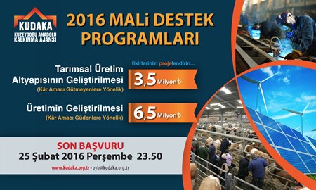 Kuzeydogu Anadolu Kalkinma Ajansi (KUDAKA), 28 Aralik 2015 tarihi itibariyle 2016 yili Proje Teklif Çagrisina çikmistir. Çagri kapsaminda iki ayri mali destek programi düzenlenmekte.Bunlardan biri Erzurum, Erzincan ve Bayburt illerinden olusan TRA1 Düzey 2 Bölgesi’nde faaliyet gösteren kâr amaci gütmeyen paydaslara yönelik olarak hazirlanmis olan “Tarimsal Üretim Altyapisinin Gelistirilmesi Mali Destek Programi”, digeri ise ayni bölgede faaliyet gösteren kar amaci güden kuruluslara yönelik olarak hazirlanan “Üretimin Gelistirilmesi Mali Destek Programi”dir. Tarimsal Üretim Altyapisinin Gelistirilmesi Mali Destek Programi’nin toplam bütçesi 3.5000.000 TL; Üretimin Gelistirilmesi Mali Destek Programinin toplam kaynak tutari Erzurum için 3.000.000 TL, Erzincan için 2.000.000 TL, Bayburt için 1.500.000 TL olmak üzere toplam 6.000.000 TL’dir. Ajans, söz konusu destek bütçesini TRA1 Düzey 2 Bölgesinin (Erzurum-Erzincan-Bayburt) sosyo-ekonomik kalkinmasina katki saglayacak nitelikli projelere hibe olarak kullandiracaktir. Programlar kapsaminda kar amaci gütmeyen kurumlarin faydalanabilecegi asgari destek miktari 187.500 TL, azami destek orani ise 875.000 TL iken kar amaci güden kuruluslar için asgari destek orani 20.000 TL, azami destek orani 500.000 TL’dir. Son basvuru tarihi 25 Subat 2016 Saat 23:50 olarak belirlenen programlara basvuru yapmak isteyenlerin söz konusu gün ve saate kadar projelerini Kalkinma Ajanslari Yönetim Sistemi (KAYS) üzerinden hazirlamis ve tamamlamis olmalari gerekmektedir. “Tarimsal Üretim Altyapisinin Gelistirilmesi” ve “Üretimin Gelistirilmesi” Mali Destek Programlarinin basvuru rehberlerine ve gerekli diger dokümanlara www.kudaka.org.tr/pyb adresi üzerinden ulasabilirsiniz. Mali destek programlari kapsaminda yapilacak bilgilendirmeler için öngörülen takvim asagida belirtilmistir. Toplantilarin yapilacagi salonlar ve takvimde yapilabilecek olasi güncellemeler ayni web adresinden ilan edilecektir.