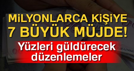 Hükümet, bayram sonrasi milyonlarin yüzünü güldürecek düzenlemeler yapacak. Emeklilerden esnafa, isverenlerden isçilere, gençlerden memur annelere kadar her kesime müjde gelecek.Bayram sonrasinda milyonlari yakindan ilgilendiren önemli gelismeler yasanacak. Emeklilerden esnafa, isverenlerden isçilere, gençlerden memur annelere kadar hemen her kesime müjdeli haber gelecek. Hükümet; 7 müjde için dügmeye basacak. Iste yüzleri güldürecek düzenlemeler:HER ÇALISANA TAZMINAT:Her çalisanin kidem tazminati almasi için hayata geçirilecek yeni sisteme iliskin taslak tamamlandi. Çalisma Bakanligi’nin hazirladigi taslak, Basbakanlik’ta. Burada son seklinin verilmesinin ardindan sendikalarla paylasilacak. Sistem, Kidem Tazminati Fonu’nu getiriyor. Mevcut çalisanlar eski sistemde kalacak ya da yeni sisteme geçecek. Yasa çiktiktan sonra ise girenler ise otomatik olarak yeni sisteme katilacak.720 BIN TASERON ISÇIYE KADRO:Kamuda görev yapan yaklasik 720 bin taseron isçiye kadro için çalismalar tamamlandi, karar asamasina gelindi. Bilim, Sanayi ve Teknoloji Bakani Faruk Özlü’nün verdigi bilgiye göre, taseron isçilere kadro konusunda 2 alternatif hazirlandi. Bunlardan birine karar verilecek. Kadro düzenlemesinin bu yil içinde tamamlanmasi planlaniyor.ENGELLI ISTIHDAMINA TESVIK:Çalisma Bakani Mehmet Müezzinoglu, bayram sonrasi engelli istihdamina yönelik yeni tesvikler ve müjdeler olacagini duyurdu. 50’den fazla isçi çalistiran isletmelerin engelli çalistirma zorunlulugunun devam edecegini belirten Müezzinoglu, “50’nin altinda ise yani 10 kisi çalistiran bir markete, mahallenin bakkalina, kasabina, pastaneye, ‘Siz engelli çalistirin devlet olarak biz sizi destekleyelim’ diyecegiz. SGK primleri ödenecek, belki maasin yarisi ödenecek” dedi.BORÇLU ESNAFA KOLAYLIKPrim borcu nedeniyle saglik hizmetlerinden yararlanamayan esnaf ve ailelerine hastane kapilari açilacak. Borçlu esnafin saglik hizmeti alabilmesini saglayacak düzenleme hayata geçirilecek. 60 günden fazla prim borcu bulunan esnaf ve yakinlari, Ekim 2015’e kadar saglik hizmetlerinden yararlanamiyordu. Yapilan düzenleme ile prim borcu olan esnafin önce yilbasina, ardindan da 30 Haziran 2016’ya kadar saglik hizmetinden yararlanmasi saglandi. Son olarak da bu süre Aralik 2016 tarihine kadar uzatildi. Hükümet, yeni düzenleme ile borçlu esnafin ve ailelerinin saglik hizmetlerinden yararlanmasinin yolunu açacak.1 MILYON GENCE IS1 milyon gence istihdam kapisini açacak eylem plani hayata geçirilecek. Basbakan Binali Yildirim’in müjdesini verdigi paket ile ilgili çalismalar bu ay tamamlanacak. Edinilen bilgiye göre; bu kapsamda, isverenlere çesitli tesvikler verilecek. Genç girisimcilere destek saglanacak. Kalkinma Bankasi imkanlari da yeni fikirler ve genç girisimcilere kaynak olusturacak.EMEKLIYE ZAM VE UCUZ TATILEmeklilerin Temmuz zammi ve memur emeklilerinin 2018 ve 2019 kazançlarinin belirlenecegi toplu sözlesme yaklasirken; 2 çalisma da masada. Ekonomi Koordinasyon Kurulu, önümüzdeki günlerde, emekli maaslari arasinda dengenin saglanmasi konusunu masaya yatiracak. Emeklilere ucuz tatil imkani da hükümetin gündeminde. Çalisma Bakanligi ile Turizm Bakanligi, bunun için kollari sivadi. ‘1 milyon emekliye ucuz tatil’ projesi için hazirlik yapiliyor. Proje ile emeklilerin Ege ve Akdeniz’de Eylül, Ekim ve Kasim aylarinda hesapli tatil yapmasi saglanacak.ANNEYE YARIM MESAIMem ur annelerin yari zamanli çalisabilmesine imkan saglayan yönetmelik büyük oranda tamamlandi. Bakanlar Kurulu’nun imzasina çikti. Önümüzdeki günlerde yayinlanarak yürürlüge girecek.