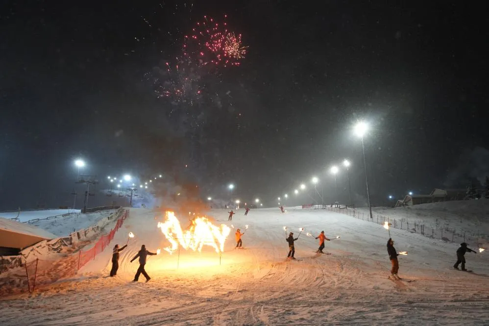 Yeni yıla meşaleli kayak gösterisiyle girdiler
