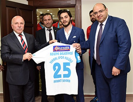 Erkekler Hentbol 1.Lig’de sampiyon olarak Süper Lig’e yükselen Aziziye Belediyesi Termalspor Hentbol Takimi’nin yönetici ve sporculari, Erzurum Büyüksehir Belediye Baskani Mehmet Sekmen’i ziyaret etti.Ziyarete Aziziye Kaymakami Zafer Öz, Aziziye Belediye Baskani Muhammed Cevdet Orhan, Kulüp Baskani Abdullah Gülakar, Hentbol Sube Sorumlusu Erdinç Siktar ve Antrenör Ali Erzurumluoglu da eslik etti. Baskan Mehmet Sekmen, “Büyüksehir Belediye Erzurumspor ve Termalspor, bize iki büyük sampiyonluk yasatti. Takimlarimizin aldigi bu basaridan ötürü sampiyonlukta emegi geçen herkese tesekkür ediyorum” dedi. Ziyaretin sonunda Aziziye Belediye Baskani Muhammed Cevdet Orhan ve Kulüp Baskani Abdullah Gülakar, Baskan Sekmen’e ismi yazili 25 numarali forma hediye etti.
