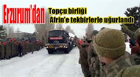 Topçu birlikleri Erzurum'dan tekbirlerle Zeytin Dali Harekati için bölgeye ugurlandi.109. Topçu Alayi’nda askerlerin ellerinde Türk bayraklariyla gerçeklestirdigi törende 200 kisilik topçu birligi tekbirlerle Suriye’nin Afrin bölgesindeki “Zeytin Dali Harekati” için bölgeye gönderildi. Topçu birliklerinin Hatay sinirinda konuslandirildiktan sonra Afrin’e gönderilecegi ögrenildi.