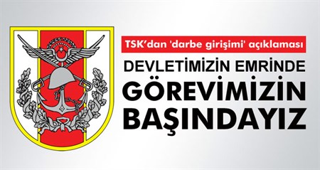 Türk Silahli Kuvvetleri’nden darbe girisimine iliskin yapilan açiklamada' 15 Temmuz 2016 aksam saatlerinde Türk Silahli Kuvvetleri bünyesinde yuvalanan illegal çete mensubu terörist hainlerin girisimleri Türk Silahli Kuvvetlerinin kahraman mensuplarinin ezici çogunlugunun aninda verdigi tepki ve kahraman Emniyet mensuplarimizin da bu konuda göstermis oldugu kararlilik ile reddedilmis ve hainler amaçlarina ulasamadan etkisiz hale getirilmislerdir' denildi.Darbe girisimi basladiktan hemen sonra olayi duyan kadirsinas halkimiz kendi bagrindan çikmis olan Türk Silahli Kuvvetlerinin gerçek evlatlarini korumak ve demokratik hukuk sistemimize vurulacak darbeyi engellemek maksadiyla sokaklara çikmis ve bu hainlere gereken en güzel ve en büyük dersi vermistir. Yapilan hain girisimin engellenmesindeki en büyük rol yüce milletimizindir.”– Illegal yapilanma mensubu darbecilerin su an itibariyle etkisiz hale getirildigini belirten TSK, mesajinda “Hukuk sistemi içerisinde hakkettikleri en agir sekilde cezalandirlacaklardir. Bu darbe girisimi esnasinda sehit olan kahraman silah arkadaslarimiza, kahraman emniyet mensuplarimiza ve içerisinde çok sayida gencimizin de bulundugu kadirsinas milletimizin kahraman evlatlarina yüce Allah’tan rahmet, degerli aile fertleri ve yakinlarina bassagligi ve sabir, bütün yaralilarimiza acil sifalar diliyoruz. Türk Silahli Kuvvetleri, devletimizin ve yüce milletimizin emrinde, görevinin basindadir” açiklamasinda bulundu.