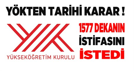 Yüksekögretim Kurulu Baskanligi (YÖK), bütün devlet ve vakif üniversitelerindeki bin 577 dekanin istifasini istedi.YÖK, bütün devlet ve vakif üniversitelerinin dekanlarinin istifasini istedi. Istifasi istenen dekanlarin bin 176’si devlet ,401’i ise vakif üniversitelerinden olusuyor.ILK ISTIFALAR GELDIYYÜ’de 15 dekan istifa ettiVan Yüzüncü Yil Üniversitesi’ndeki 15 dekan istifa etti.Karabük ÜniversitesiKarabük Üniversitesi’nde 14 dekan Yüksekögretim Kurulu’nun (YÖK) istegi dogrultusunda istifalarini sundu.Adiyaman ÜnivesitesiAdiyaman Üniversitesi’nde 13 fakülte dekani, Yüksek Ögretim Kurulu’nun (YÖK) istegi dogrultusunda istifalarini sundu.Süleyman Demirel ÜniversitesiYüksek Ögretim Kurulu’nun (YÖK), devlet ve vakif üniversitelerindeki tüm dekanlarin istifasini istenmesini ardindan Süleyman Demirel Üniversitesi’nde (SDÜ) 19 fakülte dekani istifa etti.
