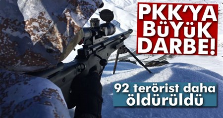 Hakkâri’nin Yüksekova ilçesinde, simdiye kadar 92 PKK’linin etkisiz hale getirildigi bildirildi.Genelkurmay Baskanligi’ndan yapilan açiklamada, “Yüksekova ilçesinde devam eden operasyonda dört bölücü terör örgütü mensubu teröristin etkisiz hale getirildigi, iki teröristin sag ele geçirildigi” belirtildi. Operasyonda, toplam etkisiz hale getirilen terörist sayisinin 92 oldugu ifade edilerek söyle denildi: “Dört el yapimi patlayici imha edilmistir. Operasyonda, toplam imha edilen el yapimi patlayici sayisi 93’tür. Iki adet dragunov keskin nisanci tüfegi, üç kalasnikof piyade tüfegi, üç tabanca, bol miktarda tibbi malzeme, ilaç, çesitli yasam ve gida maddeleri ile örgütsel doküman ele geçirilmistir.”