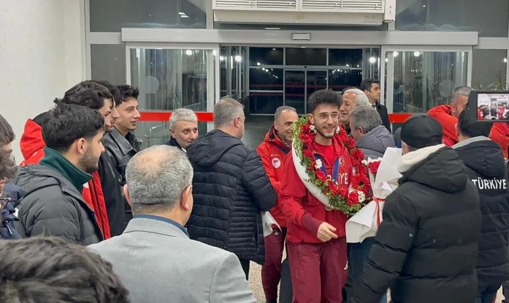 Milli sporcu Furkan Akar çiçeklerle karşılandı