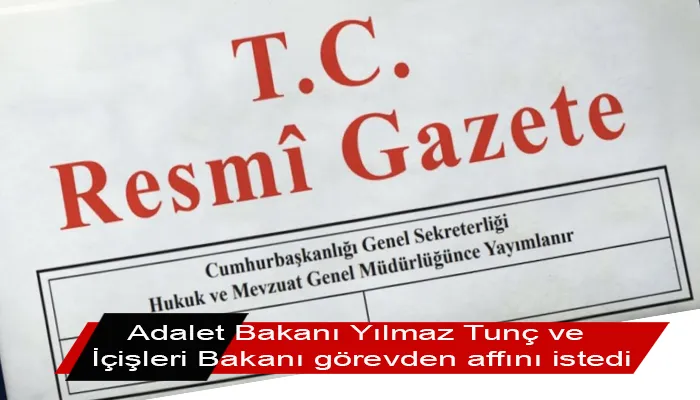 Resmi Gazete’de yayımlanan atama kararı ile görevden affını isteyen Adalet Bakanı Yılmaz Tunç’un yerine Akın Gürlek, İçişleri Bakanı Ali Yerlikaya’nın yerine ise Mustafa Çiftçi atandı.