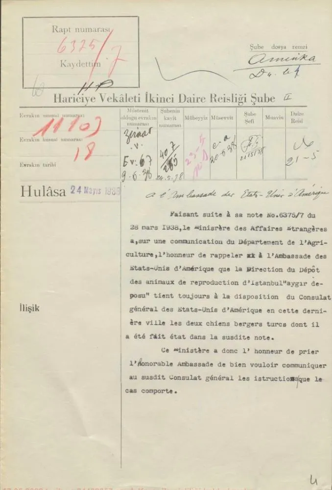 1938 yılına tarihlenen belgede, Erzurum’un çoban köpeklerinin özellikle tercih edilme sebebi olarak dayanıklılıkları, zekâları, sürü yönetimindeki becerileri ve sert iklim koşullarına uyumları öne çıkıyor. Bu nitelikler, Erzurum’un uzun yıllardır bilinen hayvancılık kültürünün, uluslararası düzeyde dahi dikkat çektiğini gösteriyor. Amerikan Ziraat Nezareti’nin talep ettiği köpeklerin özellikle Erzurum yöresinden satın alınması, bölgenin yetiştirici kimliğinin 20. yüzyılın ilk yarısında bile ne kadar güçlü olduğunu kanıtlıyor. Yazışmada, köpeklerin Aygır Deposu’na ulaştırılmasının ardından süreç hakkında Amerikan Büyükelçiliğinin resmen bilgilendirildiği ifade ediliyor. Buna karşılık elçilikten gelen notada, Amerikan Ziraat Nezareti’nin çoban köpeklerini Amerika’ya taşımak için "American Export Line" ile anlaşmak üzere olduğu, uygun vapur bulunduğunda Türk makamlarının haberdar edileceği belirtiliyor. Bu ifade, hayvan naklinin dahi dönemin diplomatik ilişkilerinde ciddi bir prosedür gerektirdiğini ortaya koyuyor.